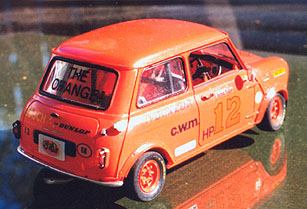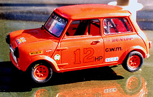 The Mini Cooper S is from the Tamiya rally kit and depicts a typical SCCA sedan. I was informed too late that H-production would be the wrong class. Need better research I guess. The fictitious Clockwork Motors entry is known as the Orange....