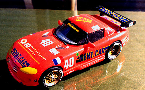 This Viper RT/10 is a Revell kit mostly OOTB with the following additions: Le Mans Miniatures wheels and tires; the decals are from Scale Designs and the roof is a vacuform piece that I market under the Penguin Productions Race Replicas name. The roll cage is scratch built and the wing and seat came from the parts box.