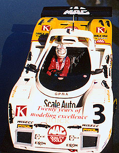 The chassis was scratch built around the interior tub from the Monogram Mustang GTP, with suspension coming from the same kit (front) and the Lola Indy Car(rear.) The interior was a lot of fun to do, in that it is wide open with lots of room to detail. Lots of electrical boxes were wired into the car as was a fire extinguisher system and a water tank for the cool suit. The dash is a modified Protar Porsche 956 unit with drilled out gauges with tubing bezels surrounding Slixx gauge decals. The driver figure was from the Lola Indy car kit. The removable wheels and tires are from a Hasegawa Group C kit.