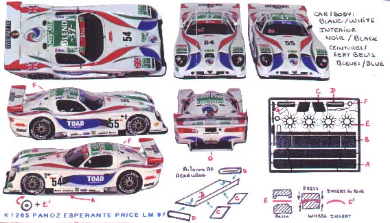 The instruction sheet (below) tells you all there is to know about putting the kit together, and Peter Radcliffe supplied the missing answers. First, there are some parts from the other LeMans Panoz (the DAMS car) that you can leave out. The small photoetched sheet with four pieces is the rear diffuser for the other car. There are also some cone-shaped resin pieces you won't need. Two strips on the upper left corner of the main photoetched sheet are apparently for the diffuser on this car, but I can't tell you how to apply them. Just chuck 'em - noone will know!