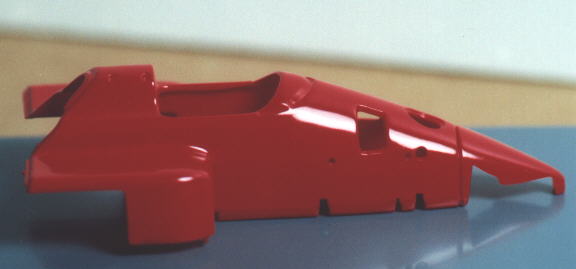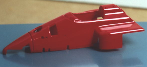 Here are some quick and dirty shots to show you how my F1/87 is coming along. I'm only at the bodywork painting and cockpit detailing stage right now. I shot it with Testors Red no. 1203, which roughly approximates the color of the later Ferraris. The bodywork needs polishing and possibly another coat to get the openings in the front and the nose completely covered.
