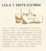 | The Lola was not successful in the 1968 Can-Am series, where John Surtees ran a private entry. The T-160 was heavily modified, but did not respond to attempts to make it more competitive. |