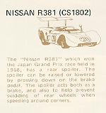The Nissan has a nicely-molded exterior that seems accurate. Details that need attention are the mirror support, which has three thinner pieces as in the box illustration, and the black screen at the rear, which looks too thick. Also the wing end-plates are probably too thick. |