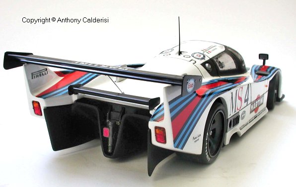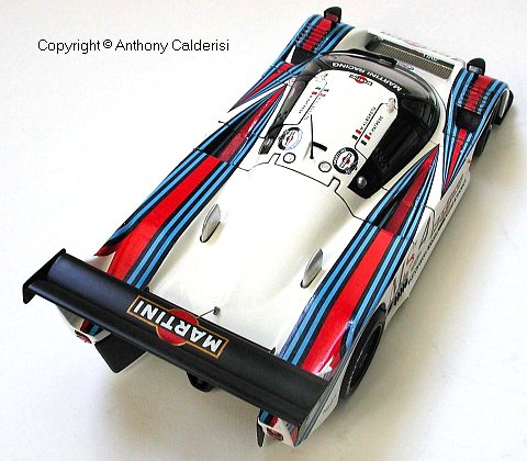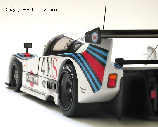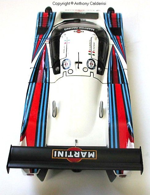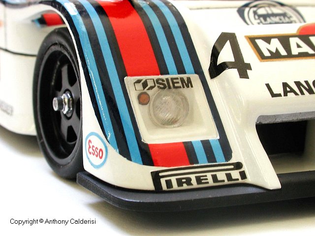 The Martini stripes and decals were the challenge. I glued tracing paper to the body and traced the shape which was then scanned into the computer. I produced the artwork based on the shape of my scanned tracing and my photo references in a Vector based drawing program, but I discovered that my output was actually better coming from a pixel based program, with no jaggies. All decals are accurate and to scale, even the license plates are authentic with the Monte Carlo crest.